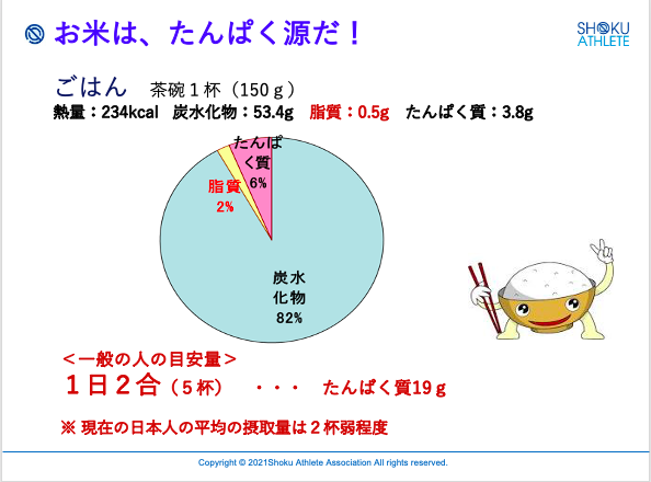 たんぱく質量だけを考えると、お肉やお魚中心の食事が良いように思えます。しかし、そうすると今度は脂質が上がってしまい、脂質過多になって胃腸の消化吸収にも負担がかかってしまうでしょう。お米は燃焼効率の良い炭水化物・エネルギー源、あるいは身体の材料となるたんぱく源として活用できるマルチ食材なのです。